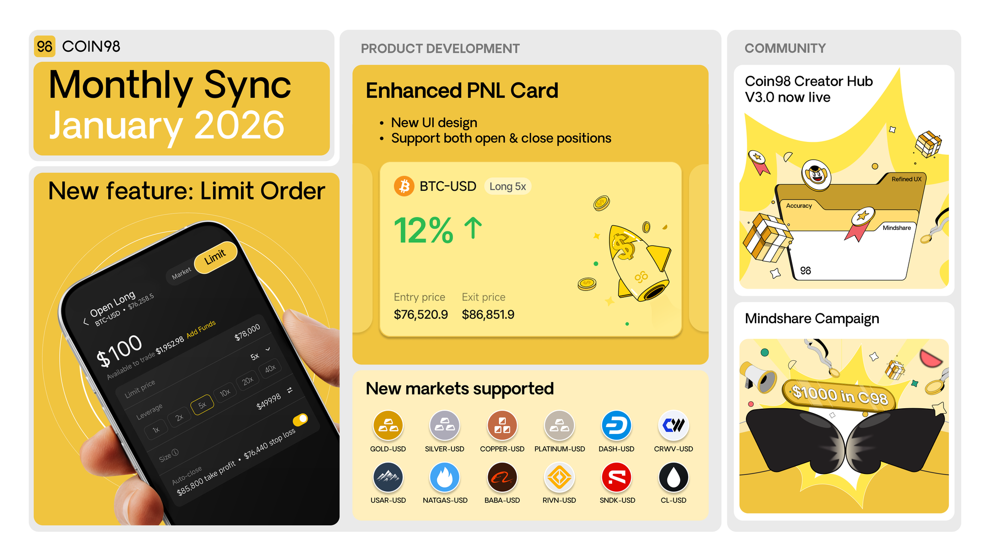 As we move into February, the momentum continues. Alongside ongoing product improvements, two campaigns, Fusion Fortune and Coin98 Perps Arena, are now live, inviting users to take part and earn rewards. Both campaigns are already underway — now’s a great time to join, trade, and grow together.