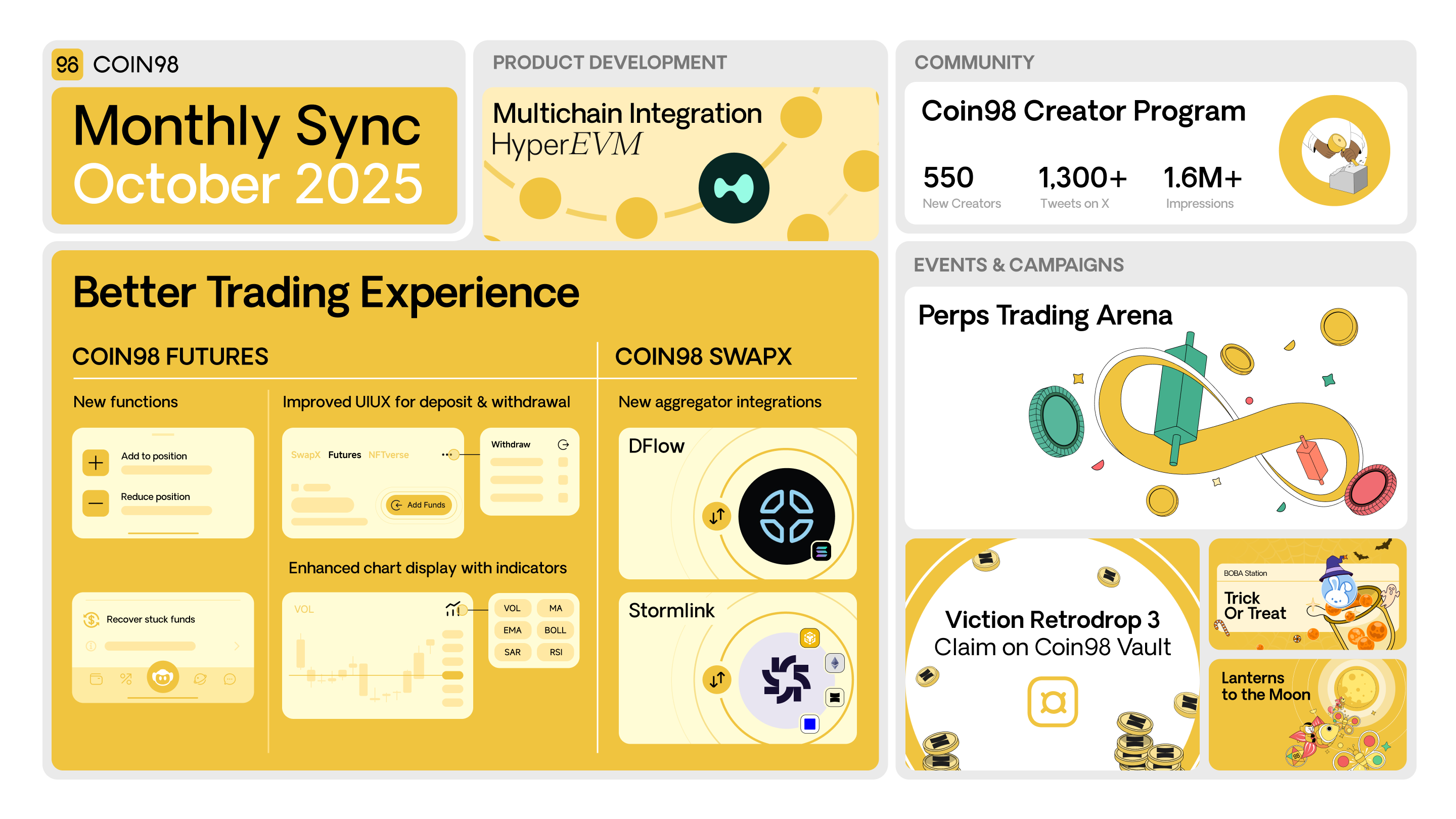 October was a steady month of progress at Coin98. We improved trading features, expanded multichain access, and continued growing with our community through ongoing campaigns and creator activities.