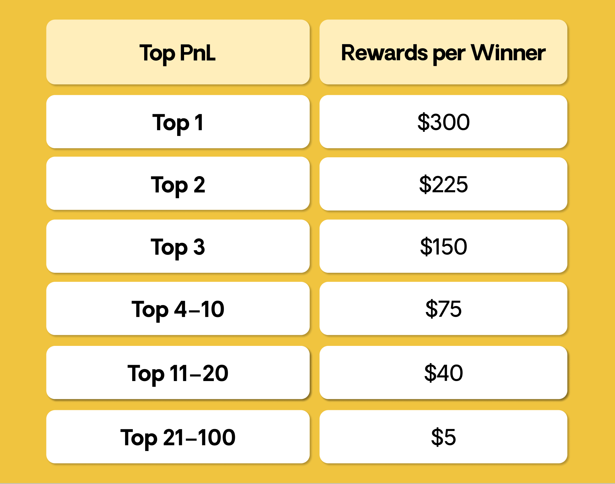 - Top PnL: Top 100 traders share $2,000 in rewards.
