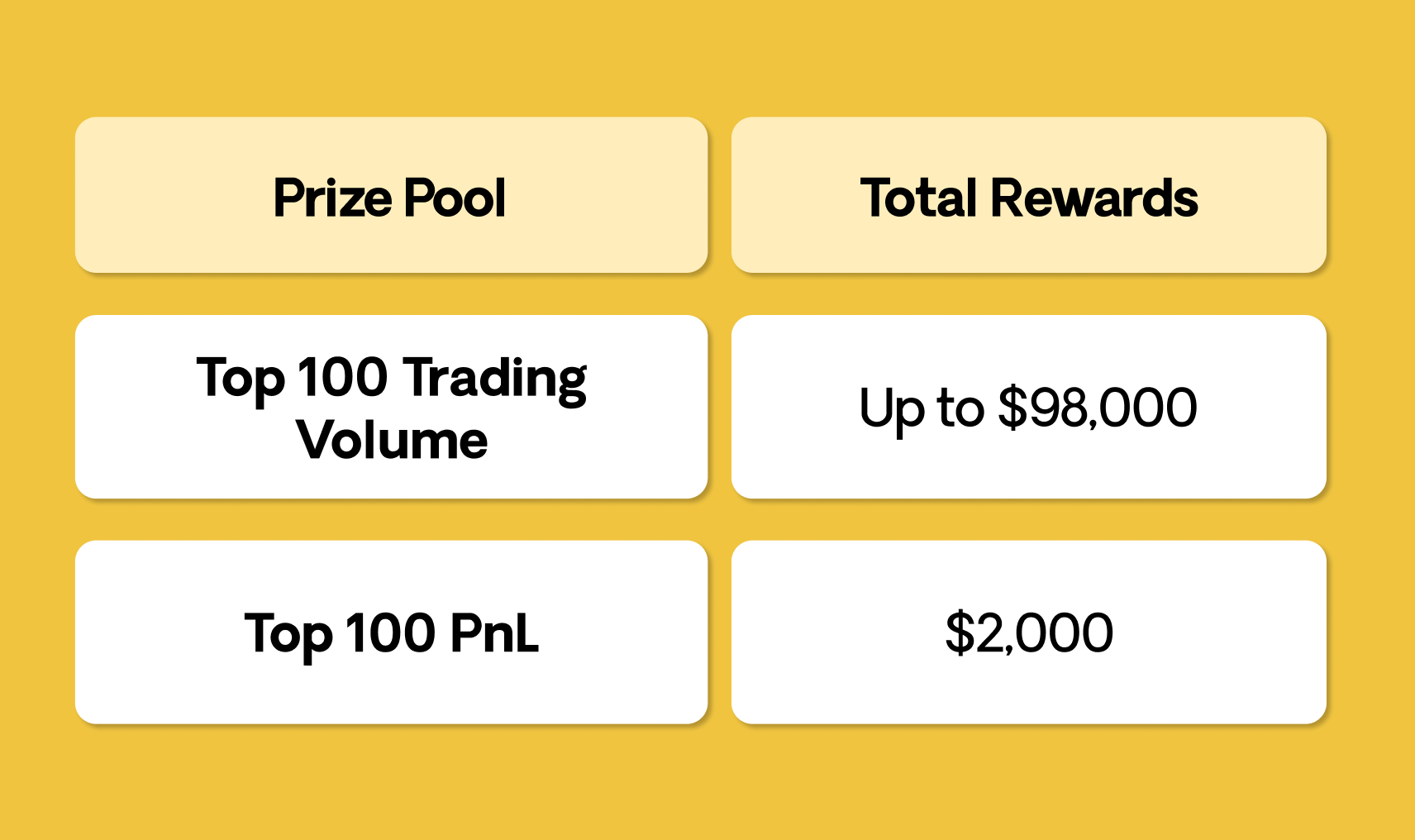 - Top Trading Volume: Top 100 traders split the pool by volume, with $200 added per $1M traded.